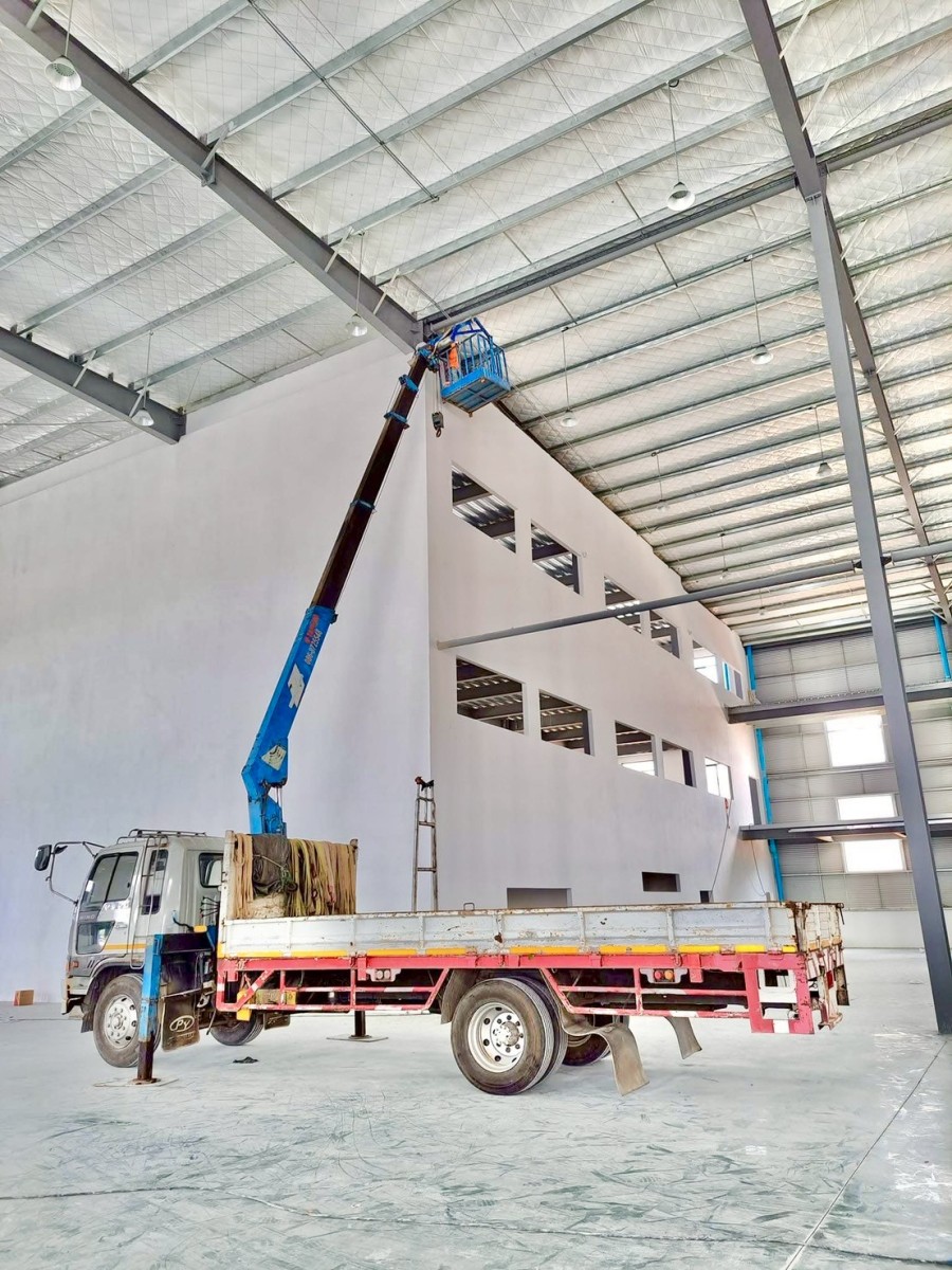 2. ติดตั้งโครงสร้างเหล็ก: ยกและวางโครงเหล็ก, แผ่นเมทัลชีท, หรือโครงสร้างหลังคา
